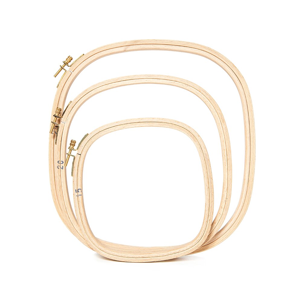 “Square hoops” with rounded corners are popular with counted thread embroiderers. The size opening is better suited for sampler work than a round shaped hoop. The width is 5/16 inch. One of the more atypical sizes we stock is a rectangular “square” hoop that is 16 ¾ inches long by 12 inches wide.