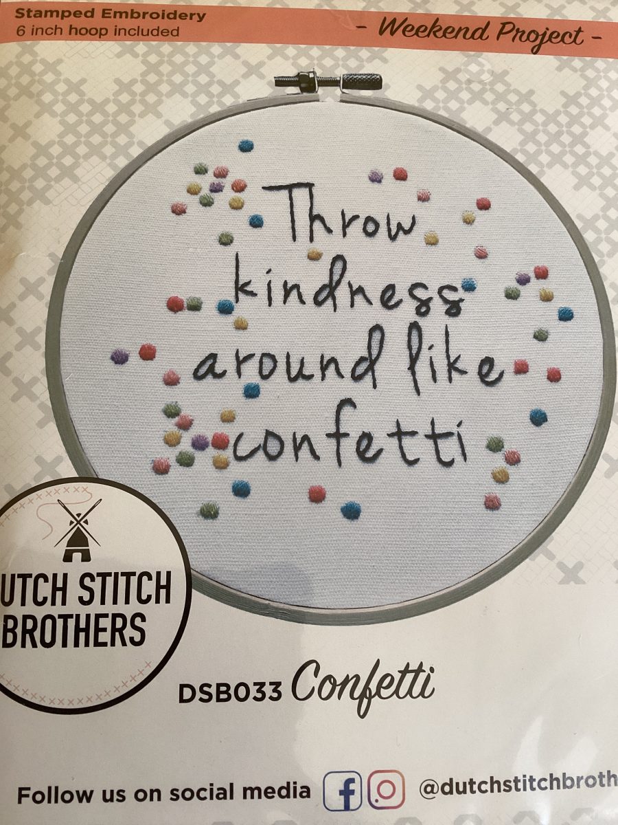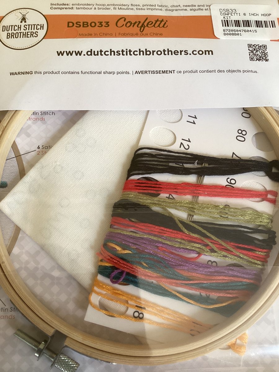 Contents: Printed fabric, 6” wooden embroidery hoop, threads, needles and instructions