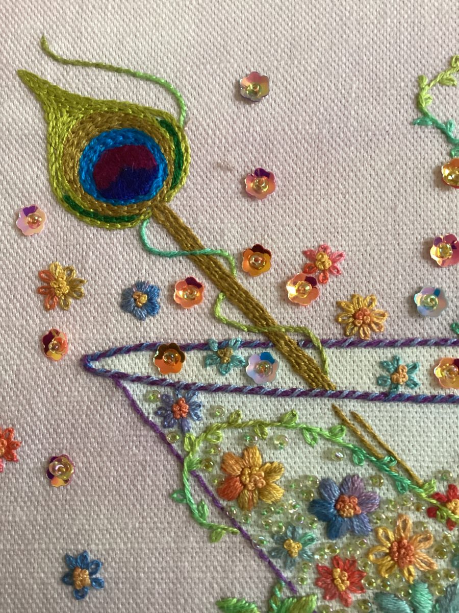 Contents: Design printed on coloured cotton fabric, needle, DMC threads, beads, sequins and step by step instructions