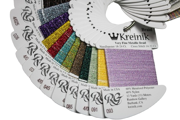 A very fine metallic chainette that is about the size of 2 or 3 strands of blending filament. Includes a very nice white metallic that is perfect for snow, stars etc..