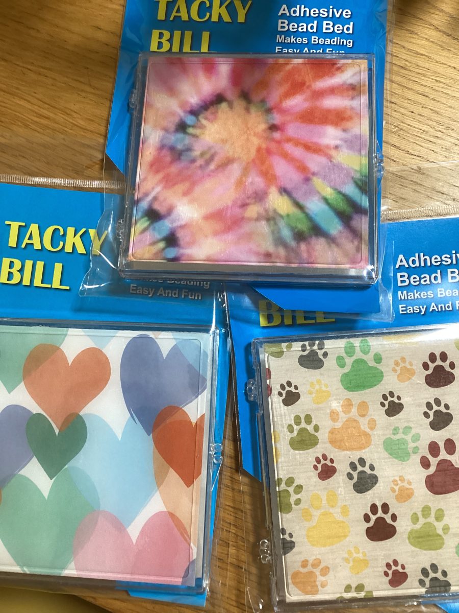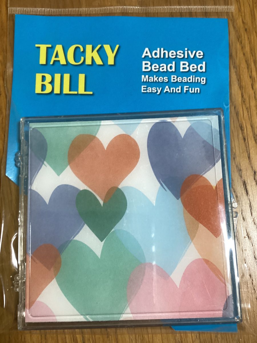 Simply scatter a few beads or embellishments onto the tacky bead bed and pick up with your needle. The tacky surface keeps the beads from rolling away